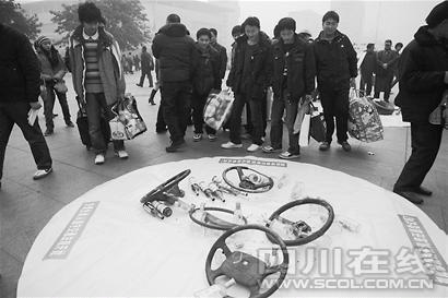 近百個(gè)酒瓶圍成一個(gè)圈,中間堆放著被撞變形的機(jī)動(dòng)車方向盤(pán),每個(gè)方向盤(pán)都來(lái)自一起帶血的車禍。民警還將紅色油漆涂在方向盤(pán)上,讓人感覺(jué)像噴出的“鮮血”……另一組“行為藝術(shù)”,是“限速60公里/小時(shí)”的標(biāo)志牌下,橫七豎八堆放著幾個(gè)變形的汽車輪胎。每一個(gè)輪胎上分別寫(xiě)著時(shí)速110公里、140公里、150公里……“這些車輪也分別來(lái)自一起起慘烈的車禍!泵窬f(shuō)。 看了兩組行為藝術(shù),過(guò)往旅客紛紛感嘆“太直觀、太震撼了!”