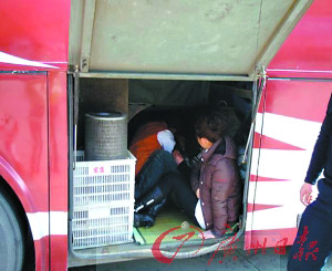 無獨有偶,同日下午2時30分,深圳黃鶴春運執(zhí)勤服務(wù)點民警在檢查豫P66999長途客車的時候,發(fā)現(xiàn)駕駛員劉某神色緊張。民警要求打開該車行李廂檢查,沒想到駕駛員劉某卻很不配合,借口行李太多,不方便檢查。在民警的教育下,司機劉某極不情愿地打開了行李廂。行李廂里的情況讓民警大吃一驚,4個大活人竟被塞在行李廂中。