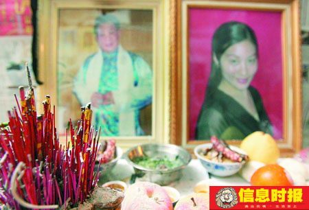 走進屋里,首先映入眼簾的是阿瑩和峰哥兩個人的大鏡框遺照,擺放在房門左側(cè)一張桌子上,前面燒滿了香!斑@個靈堂是阿瑩親手布置的,原本是作為峰哥的靈堂,阿瑩死之前偷偷做了一張同樣大小的遺照,然后把遺照放在上面,讓它變成了兩個人共同的靈堂!