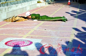昨天下午4時20分許,珠海海燕路名亭公園巴士站附近上演驚險一幕,小張和女朋友路過此處時,人行道路面突然塌方下陷,兩人猝不及防雙雙掉進深坑。小張掉進去不太深,而身旁的女朋友掉進去后,因為腳底的土地下陷太深一時不知所終,小張掙扎著爬出路面,急忙報警救助。