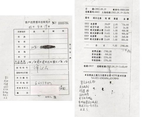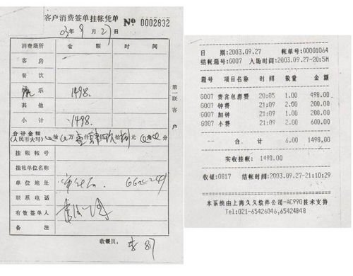 結(jié)賬小票上列明的服務(wù)包括貴賓包房費(fèi)、鐘費(fèi)、加鐘、小費(fèi)、飲料等。第一次消費(fèi)的時(shí)間為2003年4月19日,入場(chǎng)時(shí)間為晚8點(diǎn)09分,結(jié)賬時(shí)間為晚9點(diǎn)05分?傁M(fèi)金額為2296元。其中,包房共計(jì)3間,費(fèi)用為1104元(368×3);歐式按摩小費(fèi)共有3筆,其中兩筆分別為400元,另一筆則標(biāo)明數(shù)量為2,金額為800元。另一份賬單的時(shí)間為2003年9月27日,入場(chǎng)時(shí)間為晚上8點(diǎn)03分,結(jié)賬時(shí)間為晚9點(diǎn)10分。總消費(fèi)金額為1498元。其中“貴賓包房費(fèi)”是498元,鐘費(fèi)是200元,加鐘是200元,小費(fèi)是600元。