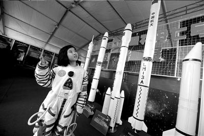 當(dāng)天下午,設(shè)在騰龍閣的航天科技體驗(yàn)場(chǎng)不斷有三五成群的游人進(jìn)出,神七返回艙的全尺寸模型、嫦娥一號(hào)的實(shí)物火箭殘骸、剛剛研制出來的長征五號(hào)運(yùn)載火箭的微縮模型……站在只有在電視上能見得到的航空物品前,小朋友拉著爸爸媽媽問個(gè)不停。旁邊,等待試穿宇航服的游客自發(fā)排起隊(duì),準(zhǔn)備過把“航天癮”!吧駳獍,快給我拍一張!焙蟻砭﹦(wù)工人員張淼第一次逛廟會(huì),穿好宇航服后,他立即站到太空照片的背景前拍照留念。