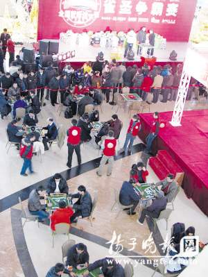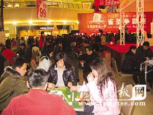 從大年初一到初三,揚州新城西區(qū)一家大型銷售、娛樂廣場“京華城”內(nèi)分外熱鬧,這里舉行了一場名為“2009雀圣爭霸賽”的大型麻將比賽。數(shù)千平方米的大廳內(nèi),共擺下50張麻將桌,過年3天,天天人聲鼎沸。麻將這一“格調(diào)”似乎不太高的娛樂活動能上升到“大賽”的層次,且辦出如此規(guī)模,在歷史文化名城揚州還是“破天荒”頭一回,在全省乃至全國也屬罕見。昨天晚上8:20,經(jīng)過3天激烈角逐,麻將爭霸賽“雀圣”終于產(chǎn)生,一位來自揚州郊區(qū)的“老太霸主”在眾人的簇擁中,滿臉喜氣領(lǐng)走價值近5000元的獎品。