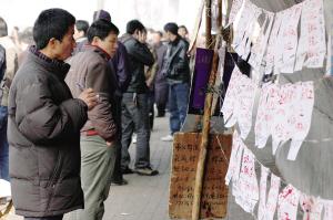 “炸油條,第一個月1400元,干得好再漲工資!痹跍刂萋放,一名手舉招聘啟事的中年男子對身邊的求職者說。面對這份待遇優(yōu)厚的工作,不少人上前詢問,可一聽對方是個小店且每天的工作量不確定時,馬上打起了退堂鼓,多數(shù)人擔(dān)心不能及時領(lǐng)到工資。“說的好聽,就怕到時候扣工資的借口更多!眮碜砸仕那舐氄邉Ⅵ握f,自己想找一份月薪1200元、管吃住的工作,這樣一年能攢下近萬元錢。