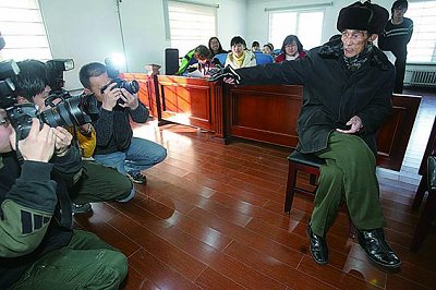檢察官宣讀起訴書時,周老漢得到照顧,一直坐在椅子上聽。