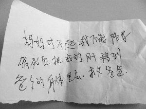 令崔女士怎么也沒有想到是,1月24日中午12點(diǎn)半左右,當(dāng)她從醫(yī)院回到家,卻發(fā)現(xiàn)自家的大門被反鎖了,“我只好從后院翻墻進(jìn)去,看到我女兒躺在床上一動不動,就像死了,旁邊有兩個(gè)安眠藥空瓶和一張遺書,上面寫著‘媽媽對不起,我不能陪你,我死后把我的肝移到爸爸的身體里去,救爸爸。’”崔女士頓時(shí)覺得天旋地轉(zhuǎn),“這兩瓶安眠藥有200粒啊!女兒是23日傍晚五點(diǎn)多在醫(yī)院吃過晚飯回家的,到我發(fā)現(xiàn)的時(shí)候,有十多個(gè)小時(shí)了!
