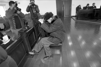 庭審時,99歲老漢周志評被法官特許坐著受審。聽了一會兒后,他放松了下來,一度還蹺起了二郎腿。