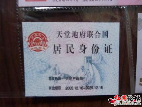 最“雷人”的是冥幣上印制的內容!其中“天堂地府聯(lián)合國居民身份證”,發(fā)證機關是天地戶籍部,最有“創(chuàng)意”的要屬其“國徽”了,上面印有國名“天堂地府”,還有“天地通用”四個字樣。而神通廣大的“天地通用”的紙幣,發(fā)行銀行是“天地銀行有限公司”,上面的圖案是傳說中的玉皇大帝。