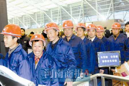鄭州新鄭機場候機廳昨日來了一群身穿工作服、頭戴安全帽的農(nóng)民工,但是,他們不是來這里改造候機樓的,而是要坐飛機去海南打工。
