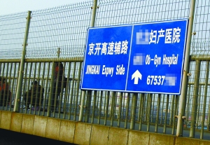 時(shí)先生所指的指路牌有四塊。其中一塊懸掛在新發(fā)地長(zhǎng)途客運(yùn)站門(mén)前的過(guò)街天橋南側(cè)護(hù)欄上,正下方為進(jìn)京方向輔路。這塊藍(lán)底白字的牌子上,并排印著京開(kāi)高速輔路和某家婦產(chǎn)醫(yī)院的字樣,旁邊還有相應(yīng)的英文和箭頭指明方向,并留有醫(yī)院電話(huà)。