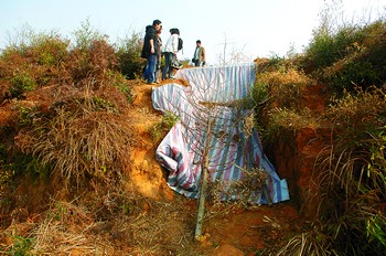 位于望城縣星城鎮(zhèn)銀星村的風(fēng)篷嶺二號(hào)墓,距離公路不遠(yuǎn)。記者翻過(guò)一道矮墻,很快便爬上墓葬所在的一座小山坡。盜洞位于山腰,現(xiàn)已被薄膜覆蓋,薄膜上還壓了些樹(shù)枝、竹條等物。記者掀開(kāi)薄膜一角,依稀可看到漆墨的盜洞。這時(shí),一名保安過(guò)來(lái)阻止記者拍照。該保安向記者證實(shí),這里前不久確實(shí)發(fā)生過(guò)文物被盜案件。