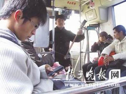 昨天下午1點(diǎn)多,在南京至浦口的一輛公交車上,車廂里突然飄蕩出胡琴聲,并伴隨著一陣蒼老的歌聲,引得車廂里乘客側(cè)目相看。這名唱歌者是一名老漢,年過(guò)六旬,一邊拉二胡,一邊唱歌。唱完幾首歌曲后,這名頗像流浪歌手的老漢,摘下頭上戴著的帽子,挨個(gè)座位向乘客收錢(qián)。有不少乘客解囊,掏出一兩塊硬幣投進(jìn)他的帽子里,也有乘客沒(méi)有理會(huì),不愿意給錢(qián)。穿著整齊干凈的老漢,到乘客跟前討錢(qián)的時(shí)候,態(tài)度比較有禮貌,并沒(méi)有死纏硬磨乘客,在車上的15分鐘內(nèi),老漢演唱了3首歌,“賺”了20多元。