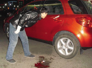 在一知情者的帶領下,記者找到了死者事發(fā)時乘坐的轎車。這是一輛紅色長安鈴木轎車,車的左側(cè)后座門把手上方,一個長約10厘米的大口子清晰可見,大口子已透過轎車鋼板,足見當時進入車內(nèi)煙花的威力之大。轎車后座的靠背上,還留有一大攤血跡。