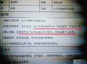 該網(wǎng)友在帖子中展示了她公司最近收到的一份求職簡歷的圖片。圖片顯示,求職的是一名來自鄭州大學(xué)的本科女生,專業(yè)是電子信息科學(xué)與技術(shù)。其中,最“雷人”的一部分在其自我評價一欄:“在大學(xué)期間被推舉為“宿舍舍長”并連任三年;細(xì)心謹(jǐn)慎,在鄭州生活三年多從來沒丟過錢包、手機或者個人證件!