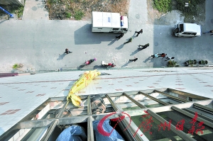 記者在案發(fā)地點(diǎn)南海鹽步霍邊新村一巷1號(hào)樓314房(實(shí)際為四樓),該房的一扇窗戶靠著旁邊的一條馬路。在一家小型商店的門前一攤血跡,而在樓頂則掛著一條用被單和鞋帶組成的繩子,隨風(fēng)搖擺。
