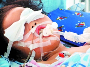 黃蓉今年6歲半,四川人。上了呼吸機(jī)的黃蓉被蒙著雙眼,躺在病床上,雖然有心跳,但對(duì)外界的刺激毫無(wú)反應(yīng)。主治醫(yī)生說,其病情危重,“已接近腦死亡”。