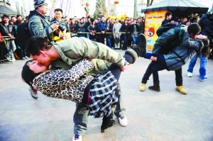 身邊的對手相繼落地,4號先生還在堅持。當(dāng)主持人宣布他是唯一還沒倒下的人時,他仍鉚著勁站了一會兒!八娴耐Τ恋!狈畔屡,4號先生重重地喘了口氣,女友則給了他一個大大的擁抱。這對4號情侶最終贏得了一部摩托羅拉手機。“手機送給女朋友,當(dāng)做情人節(jié)禮物!4號先生摟著女友,大聲地宣布。(記者王卡拉 實習(xí)生魏楠)