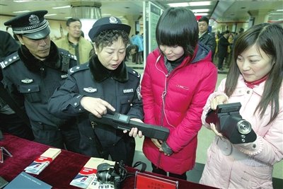 在昨天的展覽上,被查獲的違禁品裝滿20個展柜,警方在王府井站一層站廳中心用實(shí)物展柜和圖片圍成一個參觀區(qū),乘客在進(jìn)入站臺前便可以免費(fèi)參觀。