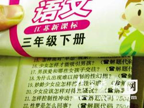 而對于在低年級書本中出現(xiàn)涉性的問題,該人士表示自己并不清楚,可能是相關(guān)機構(gòu)自己添加的。隨后他又補充說,這些話題其實是和素質(zhì)教育有關(guān)系的,在學(xué)校里學(xué)生是學(xué)不到的,因此就作為輔導(dǎo)材料的補充,多增加點知識也是好事。