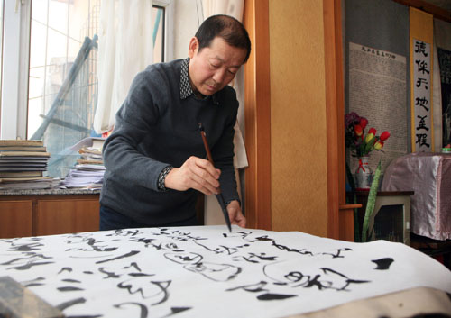記者在烏市昆侖東路孔祥福家看到,客廳正中間的墻上掛著一幅十多年前他從山東孔府帶回來(lái)的孔子碑拓畫像。畫像四周的墻壁上,還掛著別人的或他寫的關(guān)于論語(yǔ)、家族的字畫。