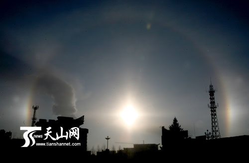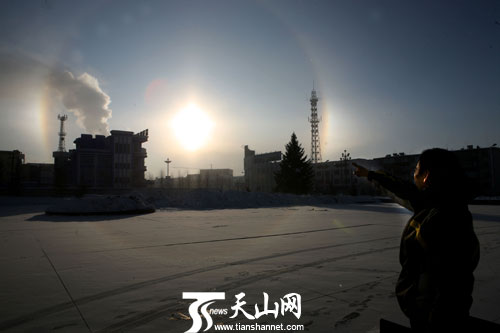2月22日上午,在新疆富蘊縣拍攝的“三個太陽”現(xiàn)象。當日,富蘊縣天氣,晴, -15 ℃ /-30℃ 。