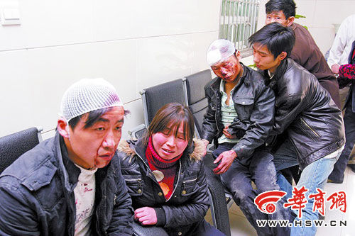 在鳳城醫(yī)院急診科,看見(jiàn)丈夫陳國(guó)權(quán)滿(mǎn)臉血跡,頭裹紗布無(wú)力地靠在大廳的椅子上,王克云立即失聲痛哭。陳國(guó)權(quán)說(shuō),頭上剛縫了6針。鐘文榜傷勢(shì)更嚴(yán)重,滿(mǎn)臉的血跡已凝結(jié),頭裹紗布,左腿已不聽(tīng)使喚。“他們兩人打我一個(gè)!辩娢陌裾f(shuō)。自己看見(jiàn)打人的頭戴著紅色的安全帽,上面有“中國(guó)華西”幾個(gè)字!笆俏(在外面)報(bào)的警,他們看見(jiàn)我報(bào)警了,追出來(lái)把我一陣亂打!币慌缘耐蹩饲暹呎f(shuō)邊流淚。