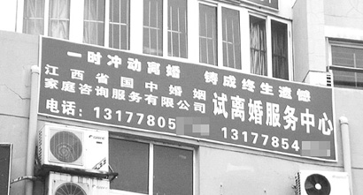 “一時沖動離婚,鑄成終生遺憾!苯眨魇∧喜斜本〇|路京城大廈外墻懸掛的一塊大型廣告牌,吸引了過往市民的注意。做廣告的不是婚姻調(diào)解機(jī)構(gòu),而是一家“試離婚”服務(wù)中心。