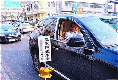 組圖中,一輛黑色保時捷正在行駛,前排一白衣中年男子將一雷人“釣具”伸出車窗外,邊行邊“釣”!搬灨汀笔且粋高爾夫球桿,“魚餌”是個“金元寶”,“垂釣”口號則是“想發(fā)財找朱!,字旁標有一個手機號碼。據(jù)圖說介紹,該場景出現(xiàn)在2月20日的深圳市羅湖區(qū)寶安北路深圳市人才市場附近。