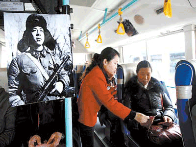 該公司相關(guān)人士介紹,601路隊(duì)已被公司命名為“雷鋒路隊(duì)”,該路隊(duì)的20輛公交車,將在車廂內(nèi)的車窗上方,張貼雷鋒的照片和語錄。