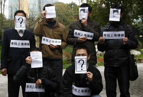 昨天上午,記者接到讀者報料趕到華山路、延安中路路口的天橋,遠(yuǎn)遠(yuǎn)就看見有7名男子身前貼著一張印有“尋找上海裸!弊謽拥募垙堅跇蛎嫔弦蛔峙砰_,引來多名行人圍觀,旁邊還有兩名女性工作人員正在給行人介紹相關(guān)活動內(nèi)容,由于天橋上行人不斷投來異樣的眼光,身貼字條的7名男子也不由自主地從站立改成了蹲姿。記者注意到,工作人員在向路人介紹時還提到了“為白血病人慈善募捐”。十幾分鐘后,圍觀的行人越來越多,引起了城管人員注意,隨后城管人員以影響交通為由將一行人請下了天橋,一行人下天橋后,直接走進(jìn)靜安公園內(nèi)!罢新隳U械浇诸^了,太夸張,先不說會不會真有人應(yīng)聘,但這種招聘行為很不文明!笔忻耜愊壬f,更可氣的是對方竟把招裸模與慈善募捐聯(lián)系到一起,讓人費(fèi)解。記者隨后又采訪了數(shù)名經(jīng)過的路人,大家均表示策劃者此舉肯定是為了吸引眼球,并譴責(zé)這樣的行為影響社會風(fēng)氣。
