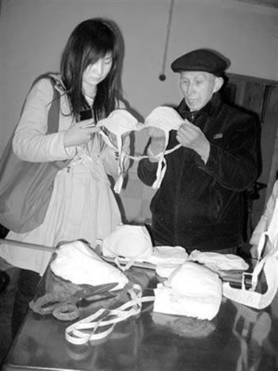 老冉現(xiàn)在琢磨的,是兩個(gè)小青年說(shuō)的貼吧和網(wǎng)店。來(lái)自四川烹飪高等?茖W(xué)校的兩個(gè)大學(xué)生正和老冉開“研討會(huì)”,面前桌子上堆滿了大小各異的胸罩,劉宇和劉梅都是學(xué)藝術(shù)設(shè)計(jì)的高材生,他們要把老冉的手藝掛到網(wǎng)上去。