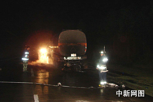 欽州消防隊(duì)10名官兵聞警迅速出動(dòng)。事發(fā)現(xiàn)場(chǎng),一輛車(chē)牌號(hào)為粵G的油罐車(chē)后輪胎已全部著火,一輛摩托車(chē)在大火中熊熊燃燒,油罐車(chē)車(chē)主已不見(jiàn)蹤影。