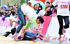 昨天下午,在東莞市新華南MALL就上演了一場別開生面的男生高跟鞋大賽,約400名男子集體穿著高跟鞋賽跑慶祝三八婦女節(jié)。盡管在情侶賽跑環(huán)節(jié)不少情侶都會驚險地摔上一跤,不過他們?nèi)孕θ轁M面沖到終點,然后再來一個深情的擁抱。
