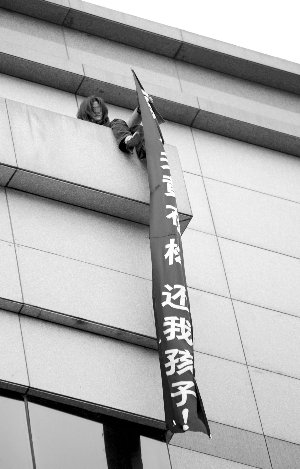 記者看到,一名身穿紅色外套的年輕女子,正坐在樓頂外墻伸出的一小塊天臺(tái)邊緣,垂著頭發(fā),兩腳懸空,一只手抓著手機(jī),另一只手拉著一條條幅,上面寫著“還我孩子”等幾個(gè)白色大字。圍觀的人越來(lái)越多,記者回頭望去,只見淮海路一側(cè)的自行車道上,整片黑壓壓的腦袋。