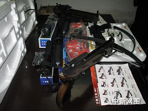 摸清情況后,派出所民警于當日下午突然出現(xiàn)在該服裝檔口,從店內(nèi)搜出小飛狼牌弓弩3把(弩是一種利用彈簧裝置發(fā)射箭頭和鋼球的器具,有較強大的殺傷力,查獲的小飛狼牌弓弩的最大射程能達到60米,精確射程為40米 )、超高壓交流脈沖電警棍3支、超高壓防爆自衛(wèi)器共1支、獵箭550支和鋼珠彈89顆。這些器具都具有非常大的殺傷力和社會危害性,一旦落入犯罪分子手中,后果將會不堪設(shè)想。