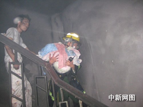 了解情況后,指揮員立即命令官兵迅速展開滅火營救行動,鋪設(shè)兩支水槍進行滅火,及時消滅樓梯口的火勢和濃煙,兩名官兵佩戴空氣呼吸器順著樓梯間深入樓內(nèi)救人,將13名被困人員分批救出,其中有一個2個月的嬰兒。經(jīng)過1個多小時的奮勇戰(zhàn)斗,大火被撲滅,被困的居民也全部被救出。