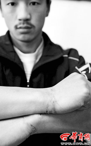 吳明的兩個手腕上有明顯的傷痕。他曾經去醫(yī)院檢查過,診斷為肌肉拉傷。他開了些療傷的藥,花費110元。