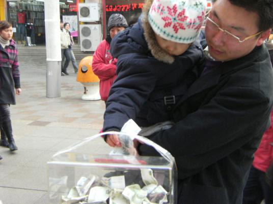 “我和我的好姐妹王靜一起,在青島市區(qū)準備組織這次捐款活動。”劉冰心說,“開始的時候由于城管管理的比較嚴格,所以只能通過市北區(qū)紅十字會協(xié)調(diào),最后允許我們的捐款活動可以組織兩天!
