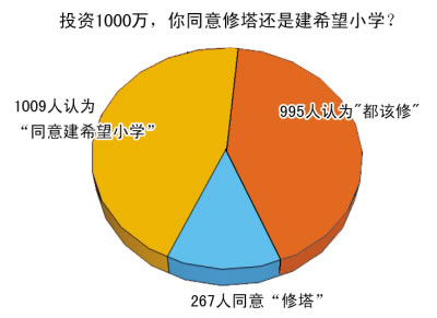 截至昨天下午5時,大渝網(wǎng)發(fā)起的調(diào)查顯示,你認(rèn)為修建第一高塔有必要嗎?2475人參與投票,1154位網(wǎng)友認(rèn)為“沒必要,又是面子工程”;1091人認(rèn)為“為了導(dǎo)航,也能增添新景觀”。在“投資1000萬,你同意修塔還是建希望小學(xué)?”的調(diào)查中,網(wǎng)上2271人參與投票,1009人認(rèn)為“同意建希望小學(xué)”;267人同意“修塔”。