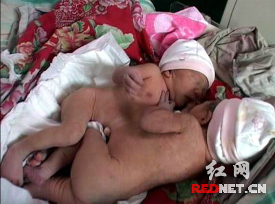 據(jù)悉,這對(duì)連體嬰兒的母親是新化縣石沖口鎮(zhèn)紅寨村28歲的段曉艷,在懷孕期間并未感到異常,5個(gè)月、8個(gè)月做B超顯示都為雙胞胎。3月16日8時(shí)許,她在新化縣中醫(yī)院婦產(chǎn)科經(jīng)過(guò)一個(gè)小時(shí)的剖腹產(chǎn)手術(shù),分娩出一對(duì)連體女?huà)。兩女(huà)霃母共空尺B在一起,出生時(shí)兩女?huà)牍惨桓殠АD壳,母、嬰身體狀況良好。