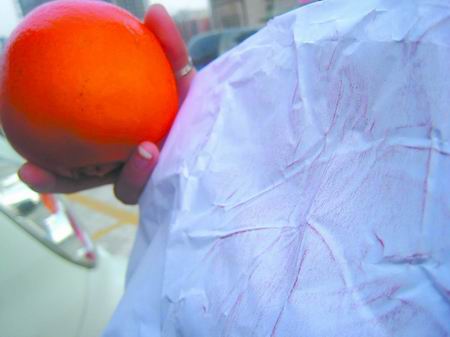 “網(wǎng)友們說(shuō),有些商販為了讓橙子色澤更漂亮、賣相更好,就把色素注射到橙子皮里,再在皮上打些石蠟,使橙子看起來(lái)很新鮮,但這樣的橙子會(huì)‘掉色’!痹S女士說(shuō),她用紙蘸了些水,在還沒(méi)食用的橙子上擦拭,“紙變成紅的了,我又用手去擠剝下來(lái)的橙子皮,流出來(lái)的水也是紅的。”