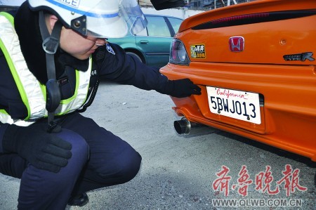 17日下午,煙臺(tái)市交警一大隊(duì)交警在南大街路段巡查時(shí),查住一輛雷人的老款本田轎跑車,該車車牌寫的全是外文。據(jù)駕駛員本人講,這副車牌是美國(guó)加利福尼亞州的車牌,他覺得洋車牌新鮮、氣派,便找別人弄到一副作廢的掛上了。交警表示,這種做法顯然是違法的,車主將面臨處罰。(記者 張琪 通訊員 趙亞林 溫全福 攝)