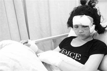 昨日上午9點半,在華西醫(yī)院急診科,馮曉蘭的兩名女同學(xué)正為她打理頭發(fā)。被鮮血浸透,頭發(fā)凝結(jié)成了一塊,根本無法梳理。經(jīng)過幾天的治療,馮曉蘭的傷勢已明顯好轉(zhuǎn),但紅腫的雙眼及面部的瘀痕依然清晰可見,緊裹紗布的雙手至今還不能動彈。她說,由于身體還處在恢復(fù)期,這些天來,起居都是由同學(xué)輪流照顧。