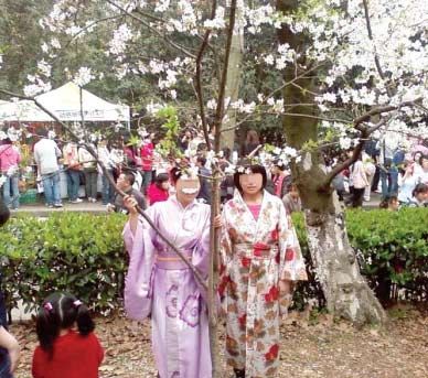 下午3時(shí)左右,兩個穿日本和服的女子出現(xiàn)在櫻花大道上,年紀(jì)較長的穿了件淡紫色和服,另一年輕女孩穿一件彩色和服,兩人站在櫻花樹下合影留念。給她們拍照的是一位中年男子,隨行的還有一位年輕女子。4人都操武漢口音,在櫻園逗留了近10分鐘,引來很多賞花市民的目光。