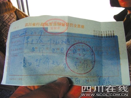 19日上午10時(shí)許,仁壽縣城區(qū)書(shū)院街,倪師傅正騎著新買(mǎi)的三輪車(chē)。一輛沒(méi)有牌照的長(zhǎng)安之星警車(chē),突然停在他面前,從車(chē)上下來(lái)兩個(gè)身著交警協(xié)警員制服的男子:“你的車(chē)不能進(jìn)城,過(guò)來(lái)接受處理!蹦邘煾到忉屨f(shuō):“警官,我是來(lái)給車(chē)上牌照的,交警大隊(duì)在城里,我必須進(jìn)城啊。”“少說(shuō)這些,違反了規(guī)定就要罰款。本來(lái)罰200元,念你是初犯,交100元就是了!彪S即,坐在該車(chē)駕駛室里的一名身著交警制服的中年男子開(kāi)了一張100元的罰款單據(jù),倪師傅最終只得無(wú)奈地交了罰款。