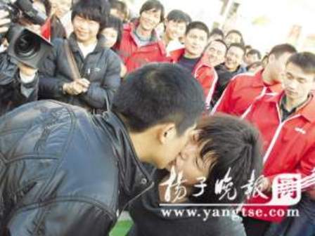 聽說有情侶當(dāng)眾接吻比賽,路過的市民紛紛停下來看個(gè)新鮮,一飽眼福。記者在現(xiàn)場看到,十幾對情侶旁若無人地盡情吻在一起。最終,來自宿城區(qū)南蔡鄉(xiāng)的劉先生和他的女朋友以7分零4秒的成績獲得了這次比賽的冠軍,當(dāng)場得到2009元的現(xiàn)金獎(jiǎng)勵(lì)。(宋時(shí)方 高峰)