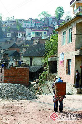 不過,如今的年輕人們再也不愿意住蘑菇房了,他們也希望住上他們見過的像城里人一樣的樓房,可是在大山里蓋樓房得花比外面更多的錢,因?yàn)榇u要從建水買了拉來,2角多一塊的磚拉到這里,已經(jīng)快達(dá)到5角錢了,還有鋼筋、水泥等,汽車?yán)瓉砗笤俦车郊遥腻X就更多了,因此,李萬勇家4年前蓋的樓房只蓋了底層。今年,李萬勇家要蓋第二層了,他的活計(jì)是拌砂灰,請來的兩個(gè)師傅砌墻,而爹媽的任務(wù)就是用背簍將磚一塊塊地背上來。