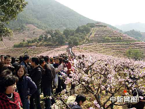 中新網寧波3月24日電 (記者 張慧慧 實習生 趙雪梨 通訊員 馮峰)3月24日上午,2009中國奉化桃花節(jié)暨第七屆蕭王廟桃花筆會在浙江奉化開幕。一大早,當地王家山上已是人頭攢動,記者只能隨著“大部隊”緩慢前行。登上山頂,放眼望去,成片的桃花延伸到每一個山谷,山間小路游人如織,場面頗為壯觀。
