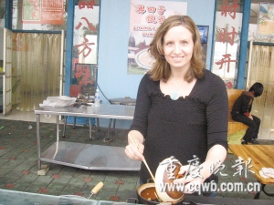 白皮膚、藍(lán)眼睛的金發(fā)少婦車凱茜30歲,是南岸洋人街“再回手”餃子店老板娘,來(lái)自加拿大。這個(gè)店,是車凱茜和老公鄭云飛愛(ài)的“加油站”。