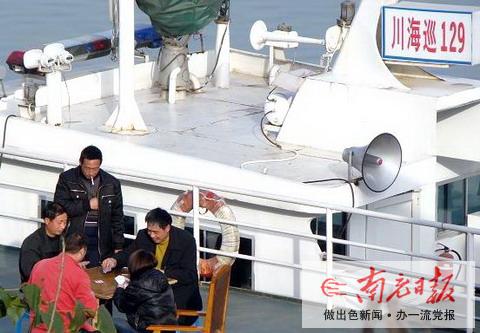 3月25日,記者在四川新聞網(wǎng)麻辣社區(qū)里看到,有關(guān)南充市地方海事局工作人員上班時(shí)間在海事船上打牌的圖片格外引人注目。網(wǎng)友稱其為“嘉陵江上最‘!未薄S浾咴诰W(wǎng)上看到,一艘標(biāo)有“中國(guó)海事”字樣的船,停泊嘉陵江三橋附近,緊挨此船停泊的是一艘“川海巡129”執(zhí)法船。